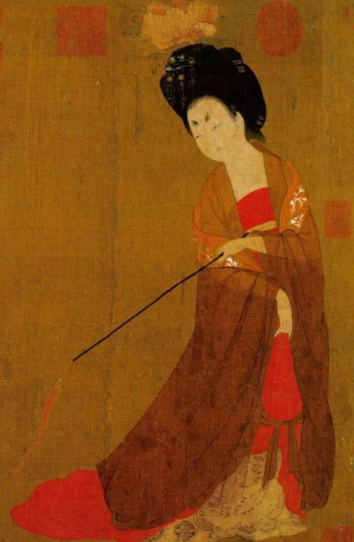 熟悉的簪花仕女图,便运用这组配色。有皇权象征的红做内搭,虽然用了朴素烟色搭配,可人家材质是纱昂,低调的奢华。
