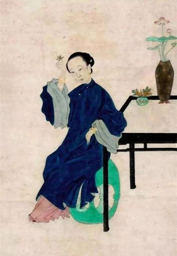 清朝时期女画家恽冰作品,画里女子服饰用大量靛蓝,应该是清朝的官家太太。皮肤部分运用淡黄,作为衬托。